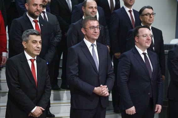 6月23日,北马其顿当选总理赫里斯蒂扬·米茨科夫斯基(前排中)及其内阁成员在首都斯科普里正式亮相。新华社发(托米斯拉夫·格奥尔基耶夫摄)