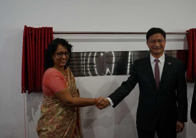 图为斯总理阿马拉苏里亚与戚振宏大使共同揭牌。