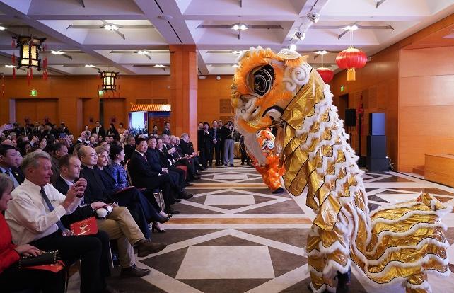 1月24日,在美国首都华盛顿举办的新春招待会上,来宾观看舞狮表演。新华社记者 吴晓凌 摄