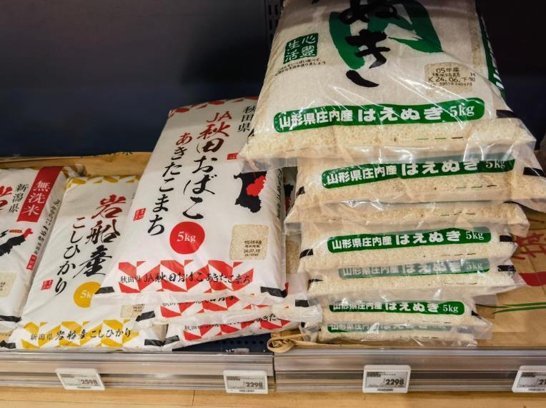 这是2024年7月26日在日本东京一家连锁超市拍摄的货架上的大米(手机照片)。新华社记者钟雅摄