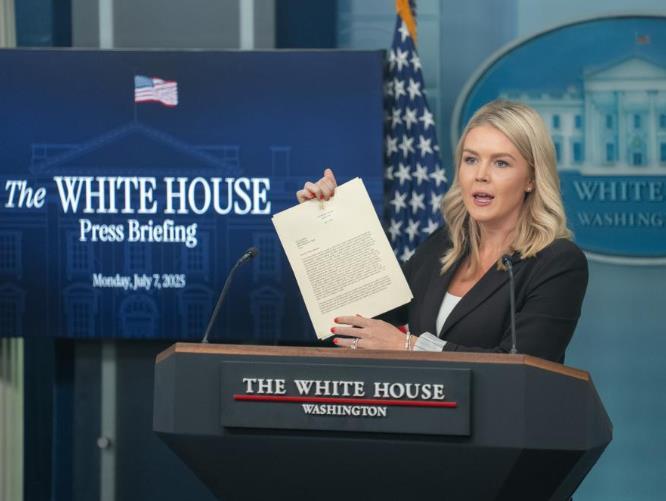 7月7日,在美国首都华盛顿白宫,白宫新闻发言人卡罗琳·莱维特在记者会上展示美国总统特朗普致日本首相的信函。新华社记者胡友松摄