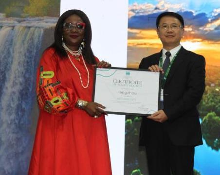 7月24日,在津巴布韦维多利亚瀑布城开幕的《湿地公约》第十五届缔约方大会上,《湿地公约》秘书长穆松达·蒙巴为中国浙江杭州代表颁发“国际湿地城市”证书。新华社发(塔法拉摄)