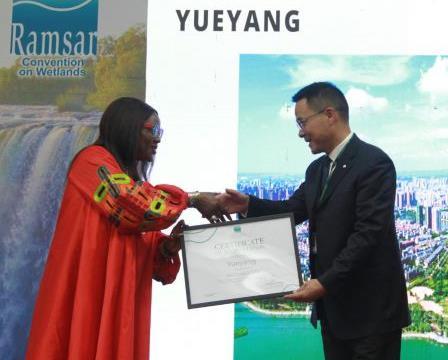 7月24日,在津巴布韦维多利亚瀑布城开幕的《湿地公约》第十五届缔约方大会上,《湿地公约》秘书长穆松达·蒙巴为中国湖南岳阳代表颁发“国际湿地城市”证书。新华社发(塔法拉摄)