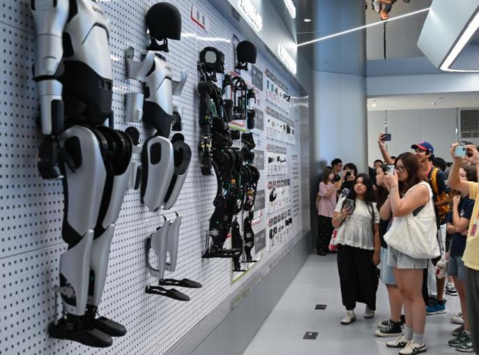 7月29日,美国飞虎队夏令营代表团成员在湖北省武汉市湖北人形机器人创新中心参观。