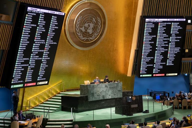 2024年5月10日,第十次联合国大会紧急特别会议以143票赞成、9票反对、25票弃权的表决结果通过决议,认定巴勒斯坦国符合《联合国宪章》规定的联合国会员国资格,应被接纳为联合国会员国。新华社发(联合国供图/曼努埃尔·伊莱亚斯摄)