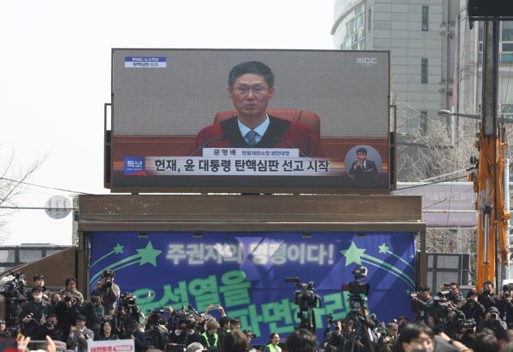 4月4日,民众在韩国首都首尔的韩国宪法法院附近观看尹锡悦弹劾案宣判过程的电视直播。新华社记者姚琪琳摄