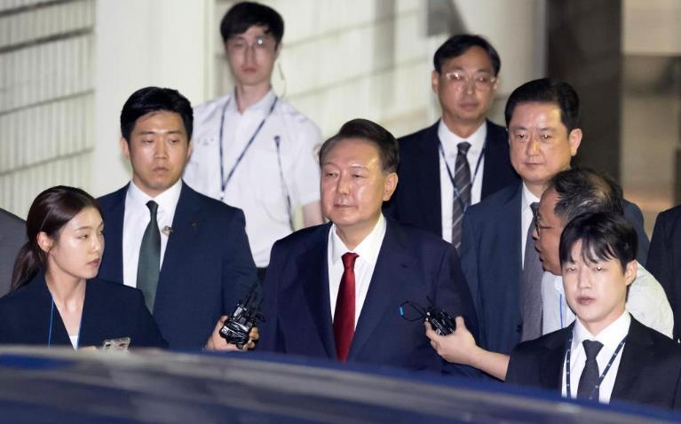 7月9日晚,韩国前总统尹锡悦接受讯问后走出首尔中央地方法院。新华社/纽西斯通讯社