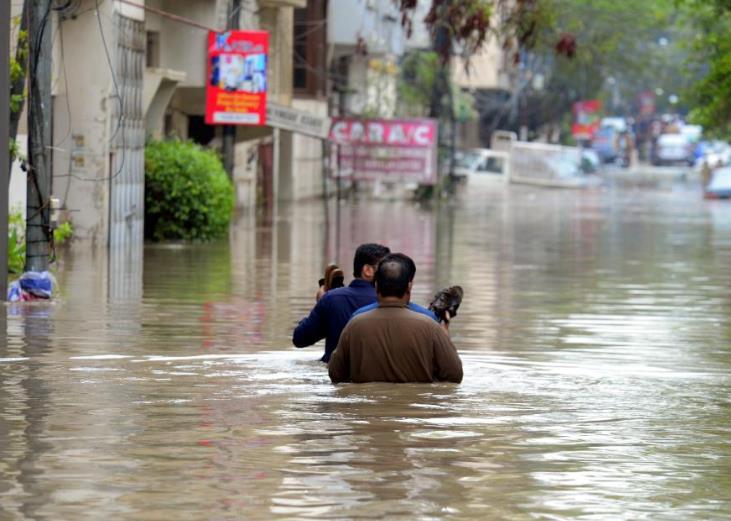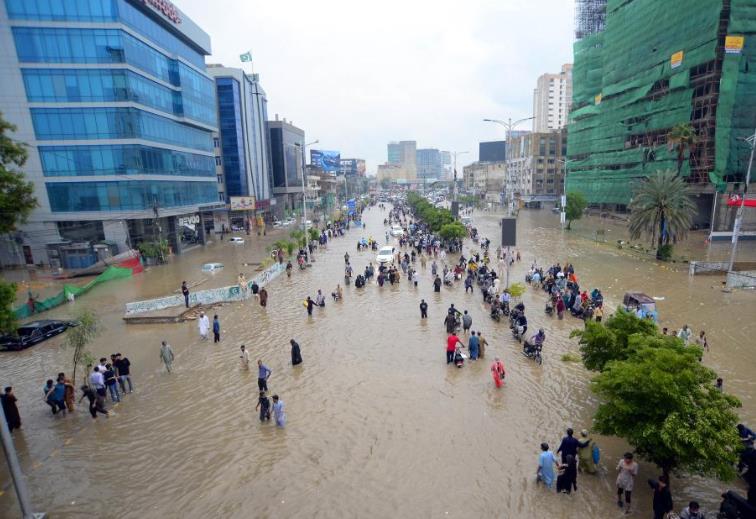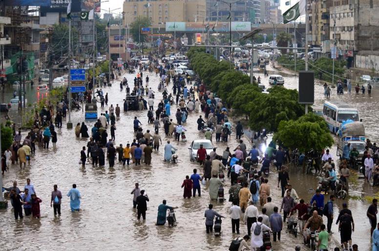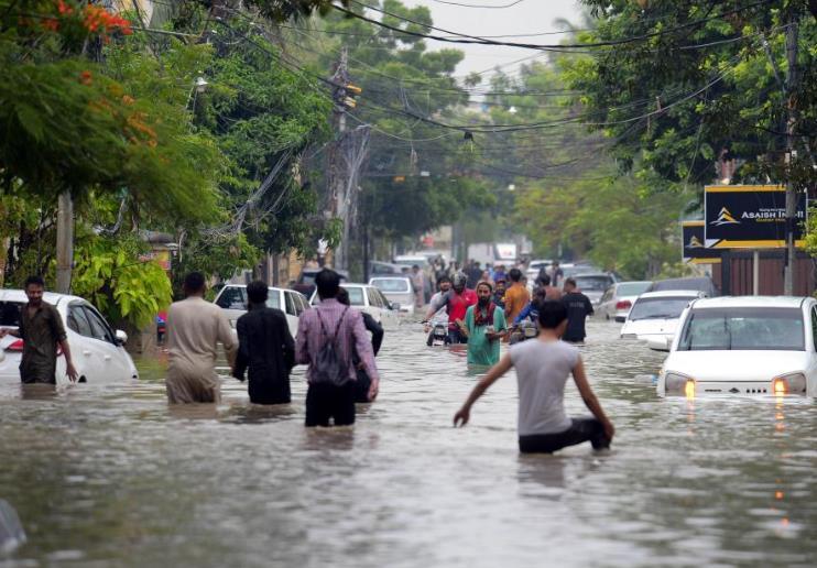 8月19日,在巴基斯坦南部港口城市卡拉奇,当地居民在暴雨过后涉水出行。新华社发