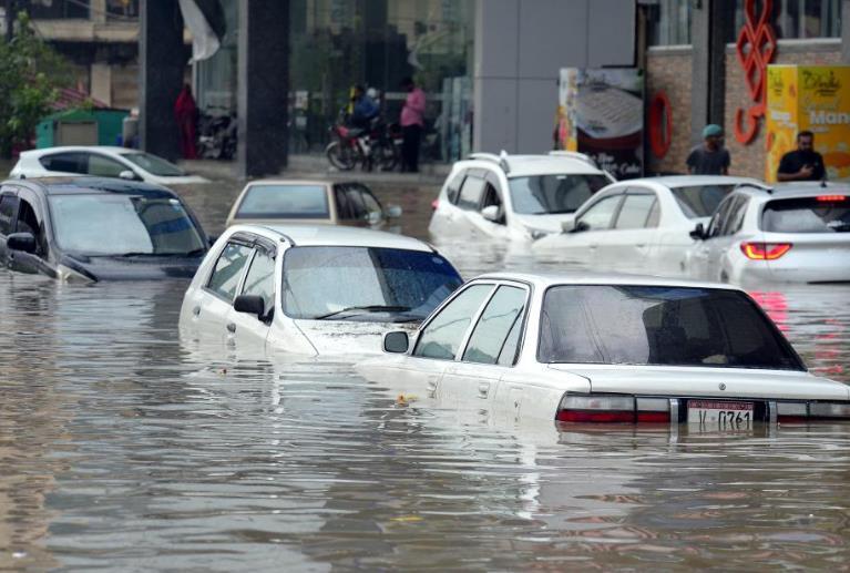 8月19日,在巴基斯坦南部港口城市卡拉奇,暴雨过后车辆浸泡在积水中。新华社发