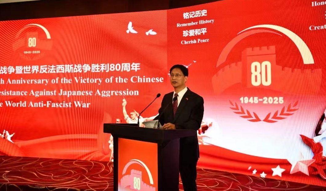 戚振宏大使在纪念中国人民抗日战争暨世界反法西斯战争胜利80周年招待会上发表讲话(中国港湾 姜健/摄)