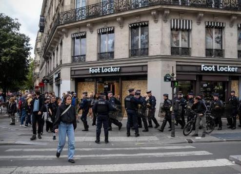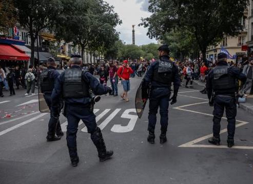 9月10日,警察在法国巴黎夏特莱广场附近的游行示威现场警戒。新华社发(奥雷利安·莫里萨尔摄)