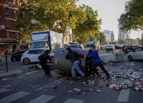 9月10日,在法国巴黎街头,示威者用垃圾桶封锁道路。新华社发(奥雷利安·莫里萨尔摄)