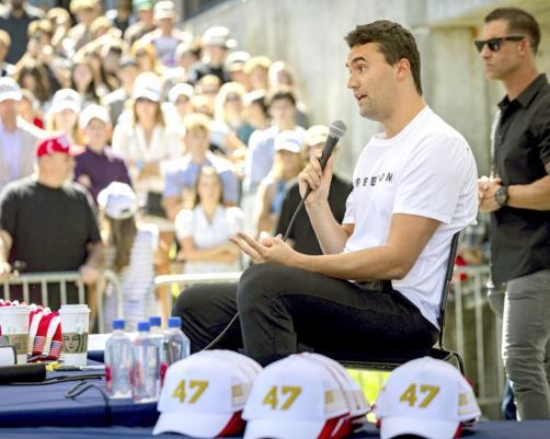 图为9月10日,查理·柯克在美国犹他州奥勒姆市的犹他山谷大学遭枪击前发表演讲。 新华社发