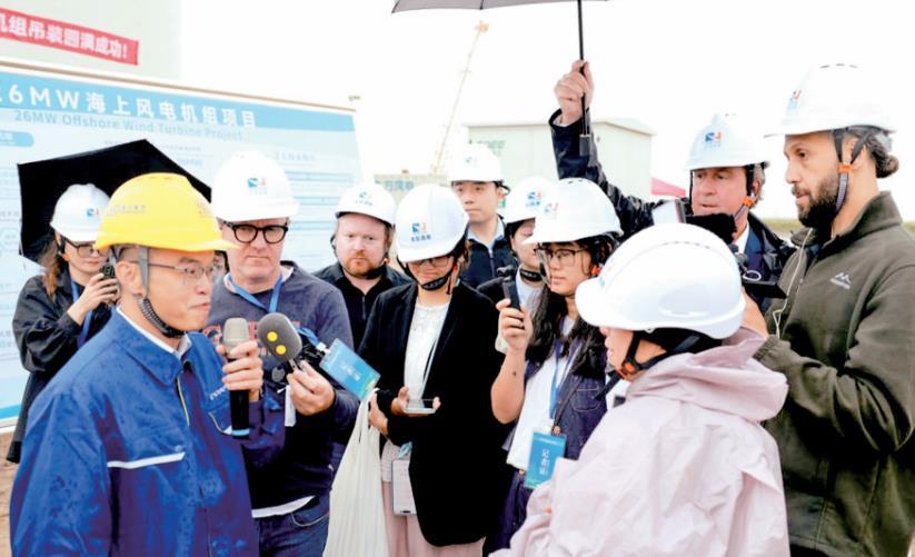 图为9月19日,中外媒体记者在位于山东东营的26兆瓦级海上风力发电机组项目现场采访。 新华社发