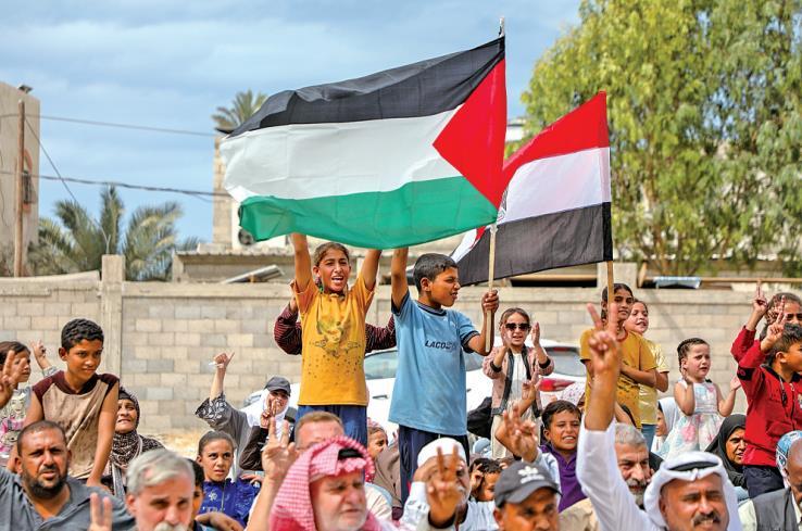 10月9日,在加沙地带中部代尔拜拉赫,巴勒斯坦民众在获悉加沙停火协议的消息后庆祝。 新华社发(里泽克·阿卜杜勒贾瓦德摄)