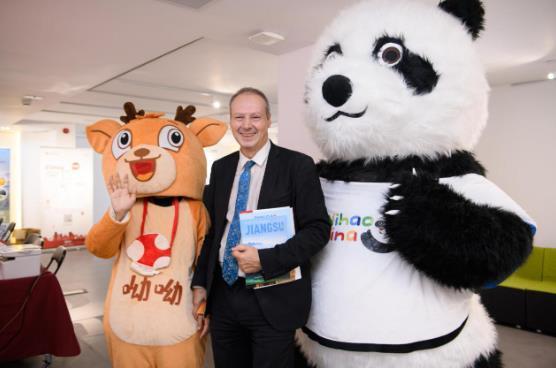 嘉宾与熊猫和麋鹿人偶合影。傅永山摄