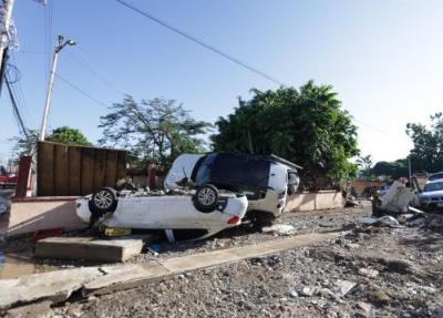 10月12日,在墨西哥韦拉克鲁斯州波萨里卡,被洪水冲毁的车辆叠落在路边。华社发(弗朗西斯科·卡涅多摄)