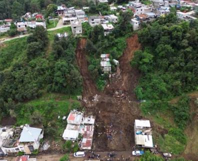 这是10月13日在墨西哥普埃布拉州瓦乌奇南戈市拍摄的降雨引发的山体滑坡现场(无人机照片)。新华社发(弗朗西斯科·卡涅多摄)