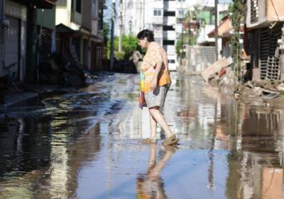 10月12日,在墨西哥韦拉克鲁斯州波萨里卡,一名妇女走过泥泞积水的街道。新华社发(弗朗西斯科·卡涅多摄)