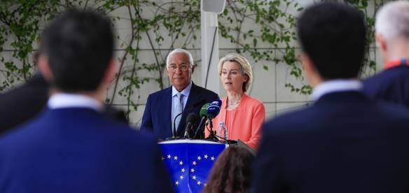 当地时间11月24日,欧洲理事会主席科斯塔(左)和欧盟委员会主席冯德莱恩就乌克兰问题举行联合发布会。 CFP供图