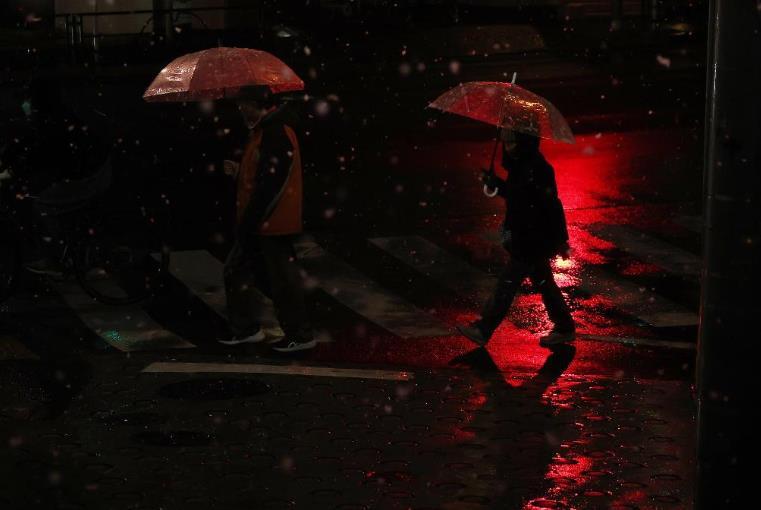 1月2日,行人撑伞走在日本东京街头。当日,受冷空气影响,日本东京降下2026年第一场雪。新华社记者贾浩成摄