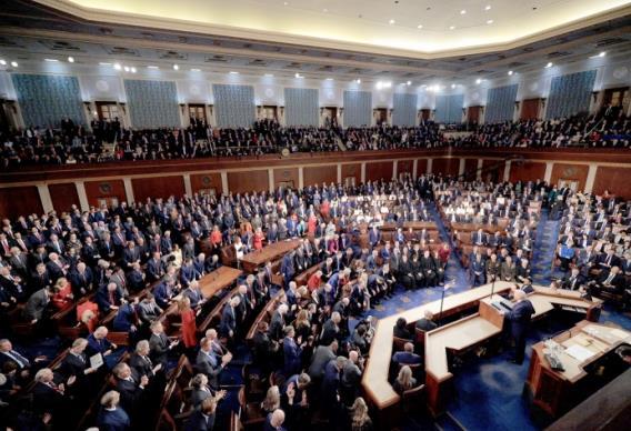 图为当地时间2026年2月24日,美国总统特朗普在国会联席会议上发表国情咨文。 CFP供图