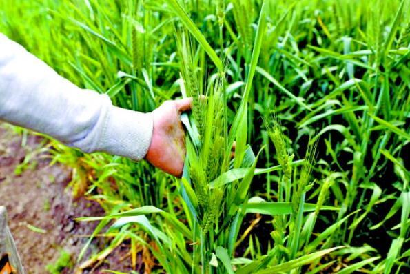 图为农民在埃及盖勒尤卜省的农田中展示因化肥供应受阻而长势不佳的麦穗。 新华社发(艾哈迈德·戈马 摄)