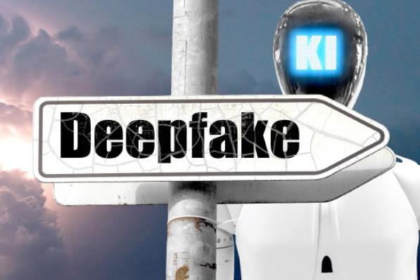 图为当地时间2026年3月12日,在德国巴伐利亚州明德海姆,写有Deepfake字样的标识与AI象征形象并置,呈现关于人工智能生成视频与声音的讨论。深度伪造技术可操纵信息,为媒体与社会带来新挑战。 CFP供图