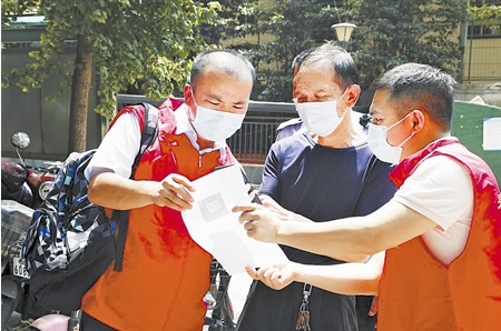 武汉市中级人民法院研究室干警张英站在检测队伍的入口处接待群众咨询,他身穿印着“是党派我来为您服务的”红马甲,额头和发丝布满了密密匝匝的汗珠。