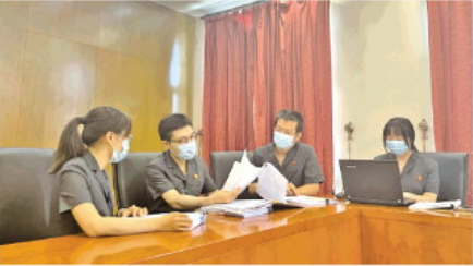 图为陶钧(左二)正在参与合议案件。 北京市高级人民法院供图