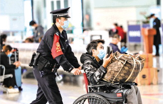 图为高明伟为行动困难的旅客提供帮助。 王荣鑫 摄
