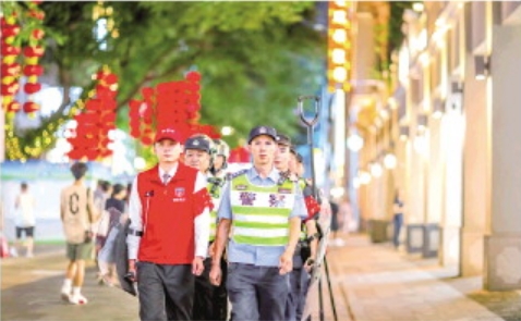 图为广州公安民警和最小应急单元队员联合在街头开展巡逻。