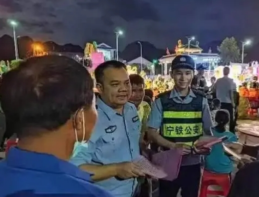 图为2021年,永安派出所民警李燮(左二)联合宁铁公安在永安高铁站进行安全防护宣传。警方供图