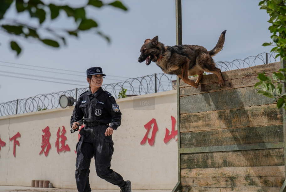 图为训犬员正在对警犬开展训练
