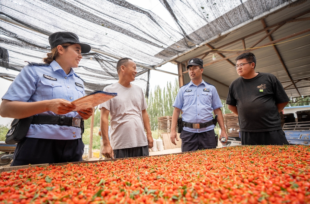 新疆叶城县江格勒斯乡的百亩枸杞田硕果满枝,一串串红润的枸杞挂满枝头,格外诱人。7月15日,叶城县公安局结合辖区实际,采取有效措施,把警务工作融入乡村振兴,深耕“民生警务”“服务警务”,以保农、护农、利农为目标,主动开展治安巡逻、交通管理、安全宣传、防火及服务群众等工作,全方位、多渠道为枸杞采摘保驾护航。