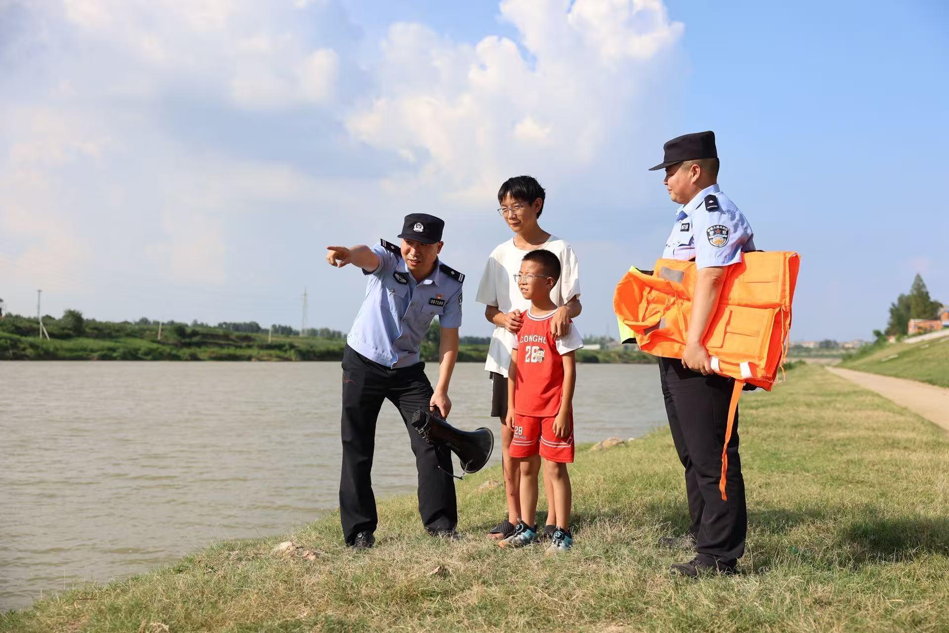 7月18日,湖北省襄阳市公安局襄州区分局双沟派出所民警辅警在辖区内开展防溺水巡查、宣传劝导工作。图为民辅警在水域边向群众宣传防溺水常识。