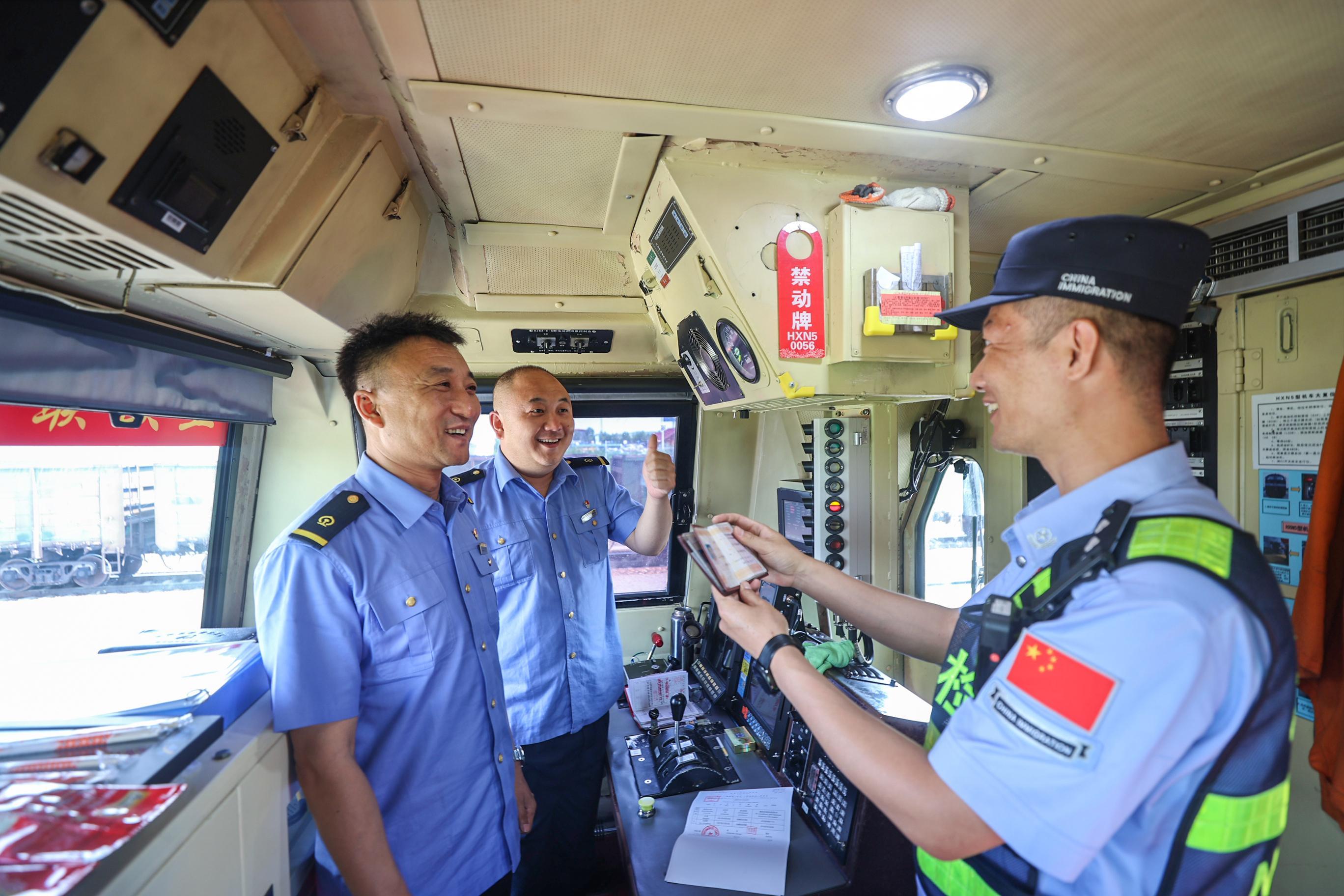 图为满洲里边检站移民管理警察高效护航中欧班列获点赞。