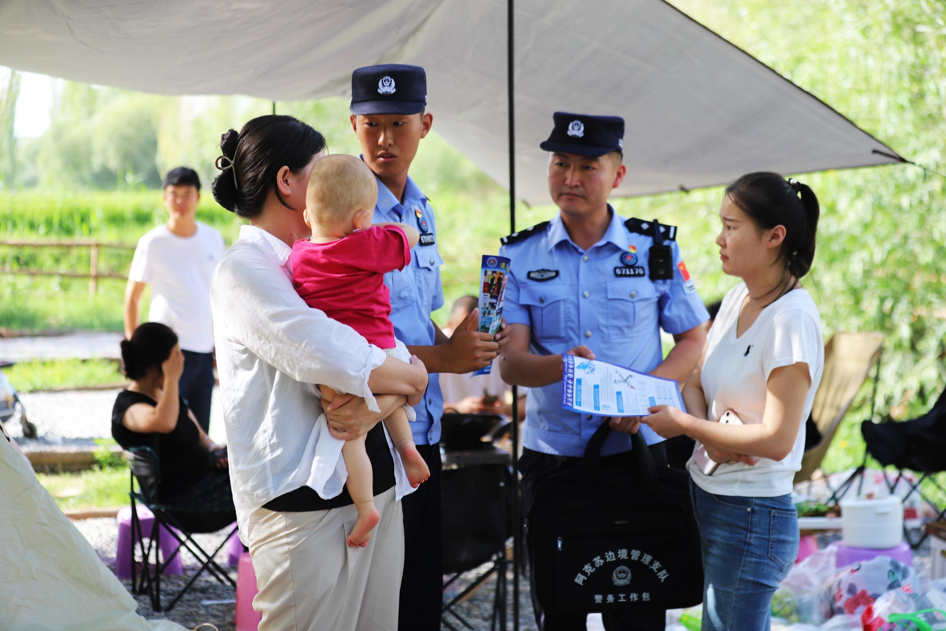 随着气温升高,新疆阿克苏地区户外露营活动持续火热。8月3日,新疆出入境边防检查总站阿克苏边境管理支队吐木秀克边境派出所组织警力走访辖区各露营基地,重点了解消防设施配备、安全警示设置、电器线路规范及明火禁令执行情况,对发现的安全隐患问题现场指导整改,营造安全、有序、和谐的环境。