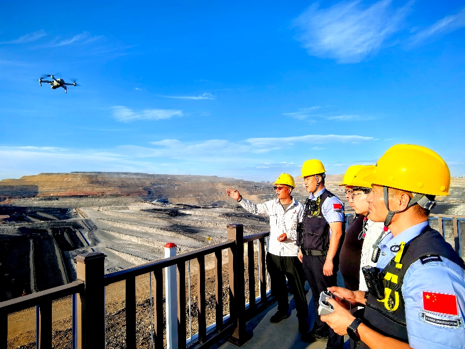 图为8月5日下午,北山煤矿边境派出所联合当地自然资源等部门启用警用无人机进行空中巡检排查。