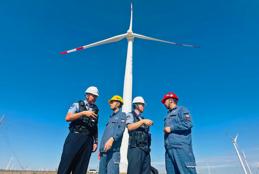 图为派出所民警与企业安全员在风电厂区开展联合安全检查。