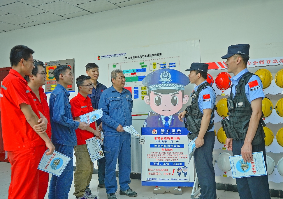 新疆出入境边防检查总站昌吉边境管理支队老君庙边境派出所辖区有多家风电企业,这里全年7级以上大风天气多达240余天,“风警”成为了辖区群众对派出所民警最常用的称呼。8月6日,派出所民警联合辖区风电企业安全员逆风而行,对风电场区设备运行安全隐患进行排查,并对风电企业员工开展防范电信网络诈骗宣传,提升企业员工防诈反诈意识,助力企业安全生产。