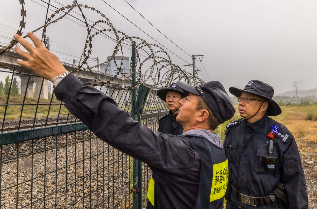 8月11日早晨,新疆乌鲁木齐市遭遇极端恶劣天气,为确保恶劣天气下高铁线路安全,乌鲁木齐铁路公安处西站派出所立即启动“恶劣天气紧急预案”。在大雨中,民警采取徒步巡查方式对高铁牵引线和中欧班列运输重点区段易发生安全隐患线路进行细致排查,全力确保暑期铁路运输生产安全和旅客生命财产安全。