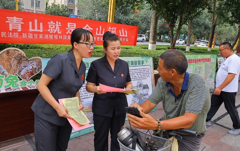 8月15日是全国生态日,当天,新疆精河县人民法院、新疆甘家湖梭梭林国家级自然保护区管理局精河管理分局工作人员联合走进精河县主要街道,以摆放展板、发放宣传资料等方式,向广大群众开展法律知识宣传活动。