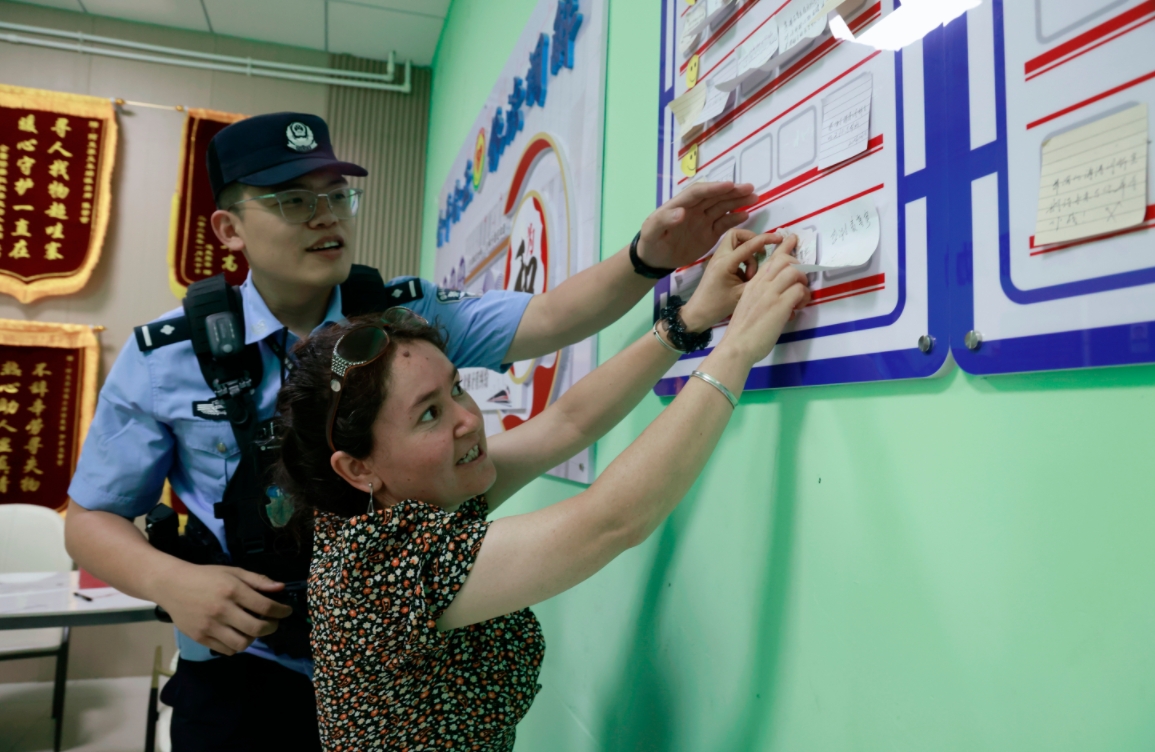 图为受到帮助的旅客将感谢寄语贴在阿克苏站派出所“海涛调解室”内的留言展板上。武陇慧 摄