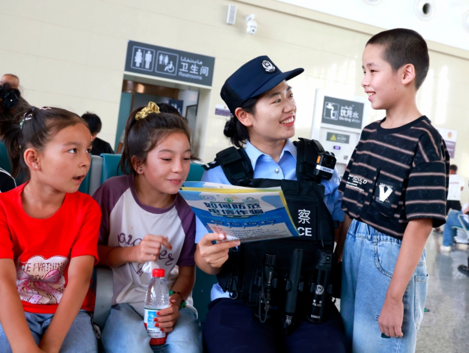 图为阿克苏站派出所民警在候车室向青少年开展普法宣传。武陇慧 摄