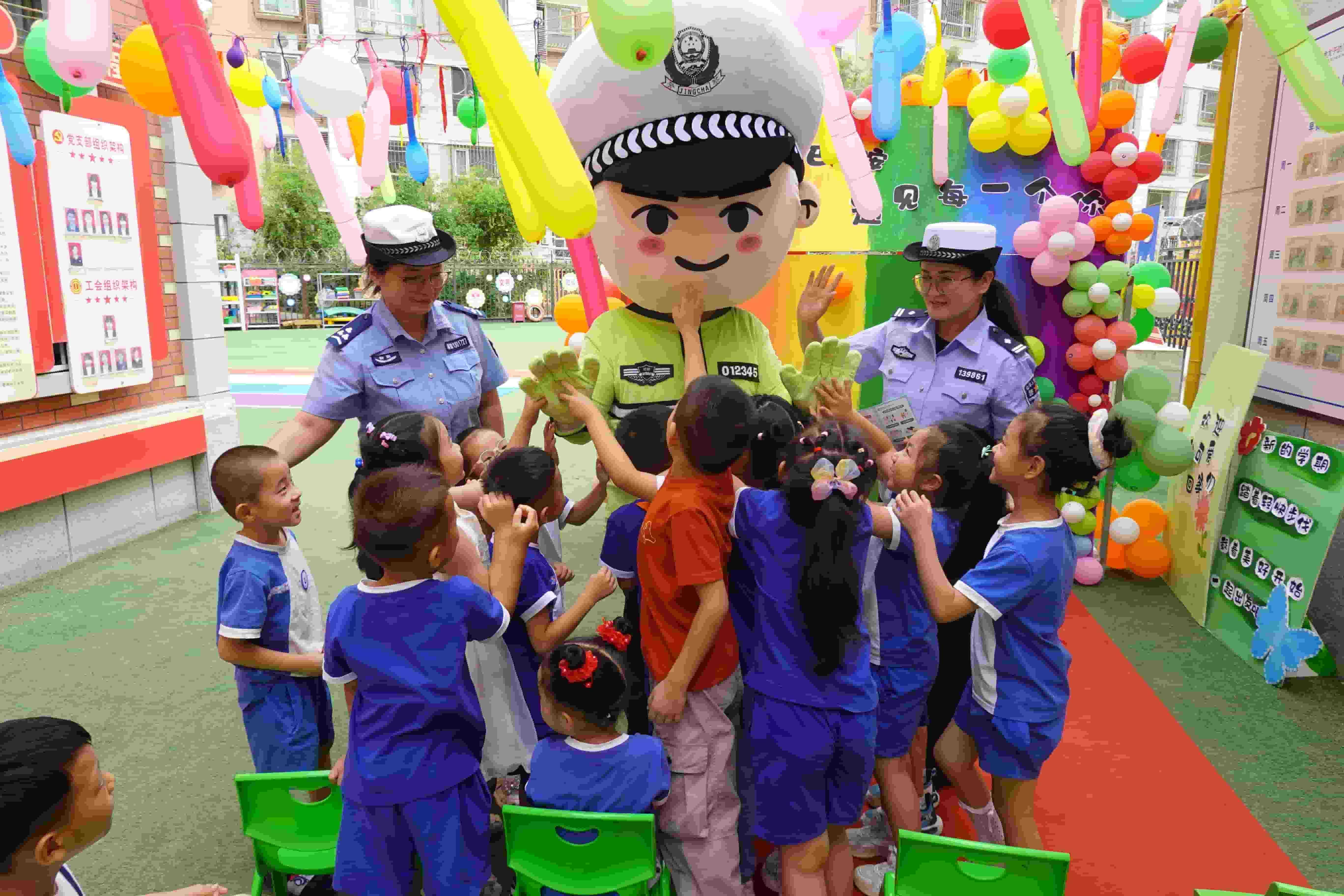 为进一步提升小朋友的交通安全意识,培养文明出行习惯,8月18日,新疆库尔勒市公安局交通管理大队组织民辅警,带着萌萌的“香梨交警”玩偶来到辖区幼儿园,用通俗易懂的语言、生动有趣的互动交流、喜闻乐见的形式,为小朋友们带来一堂别开生面的“‘幼’见交警、安全‘童’行”开学第一课。