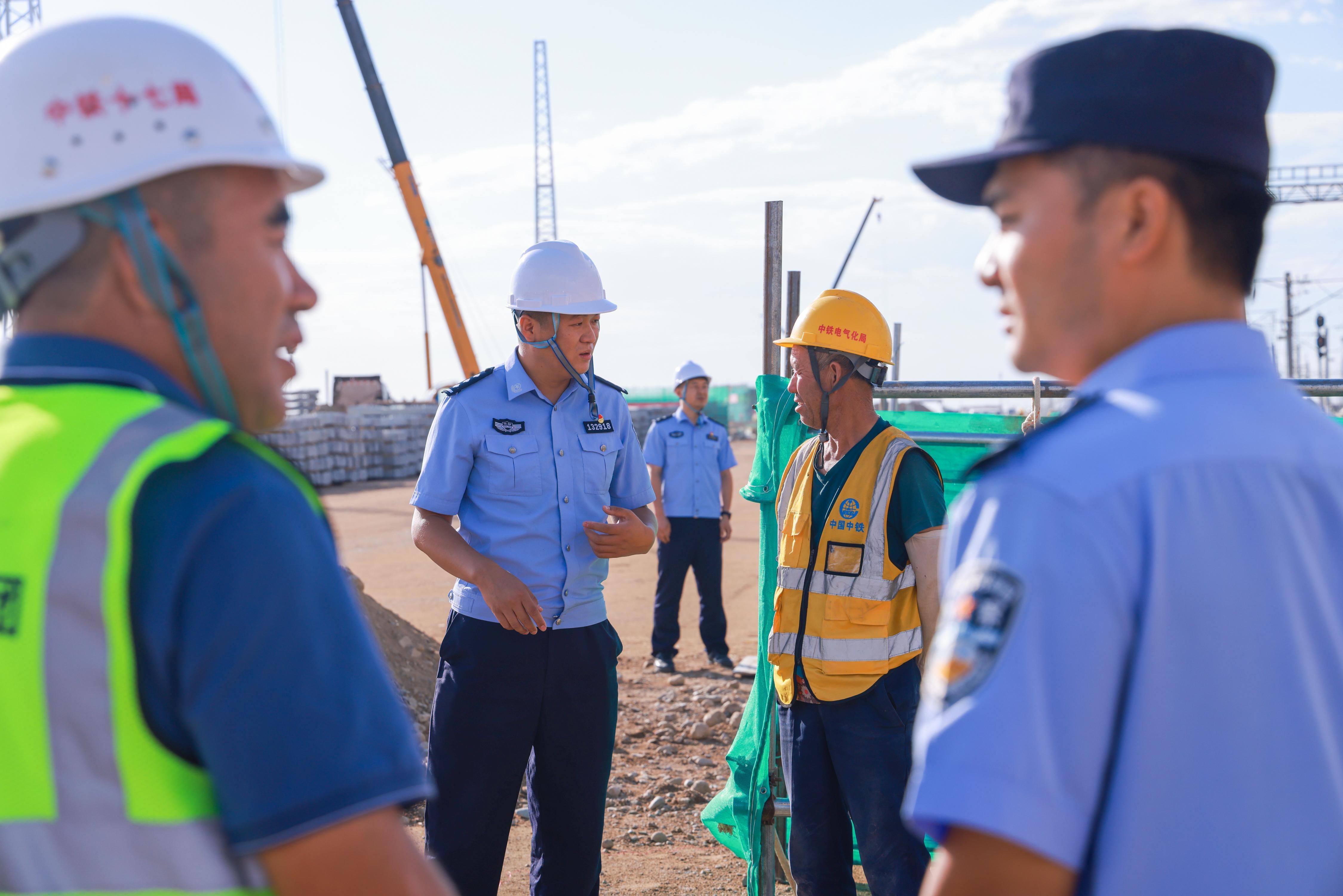 图为8月20日,哈密公安处刑侦支队民警在哈密东站施工现场开展“沉浸式”普法宣传和安全检查。
