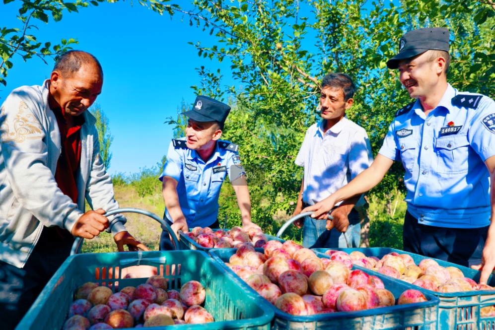 时值八月,硕果飘香,新疆温宿县的广大果农迎来水果丰收季,采摘、运输、销售……呈现出一片繁忙景象。温宿县公安局将警务触角延伸至田间地头,扎实开展巡逻防控、矛盾化解、安全宣传、帮助采摘等服务群众工作,守护“致富果”,助力乡村振兴。