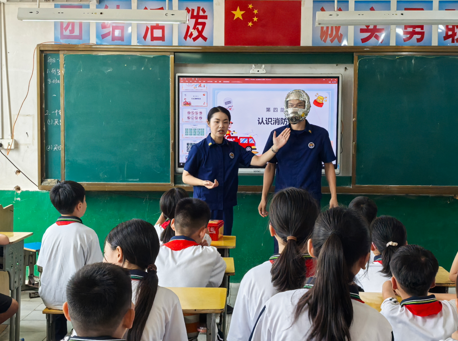 图为9月4日,消防人员为莲花县城北小学学生讲解消防安全知识。