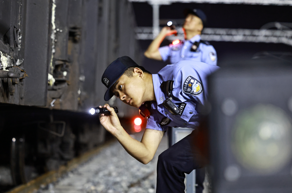 图为9月23日晚,乌鲁木齐铁路公安局库尔勒公安处若羌站派出所民警对站停货运列车进行夜间安全巡视。